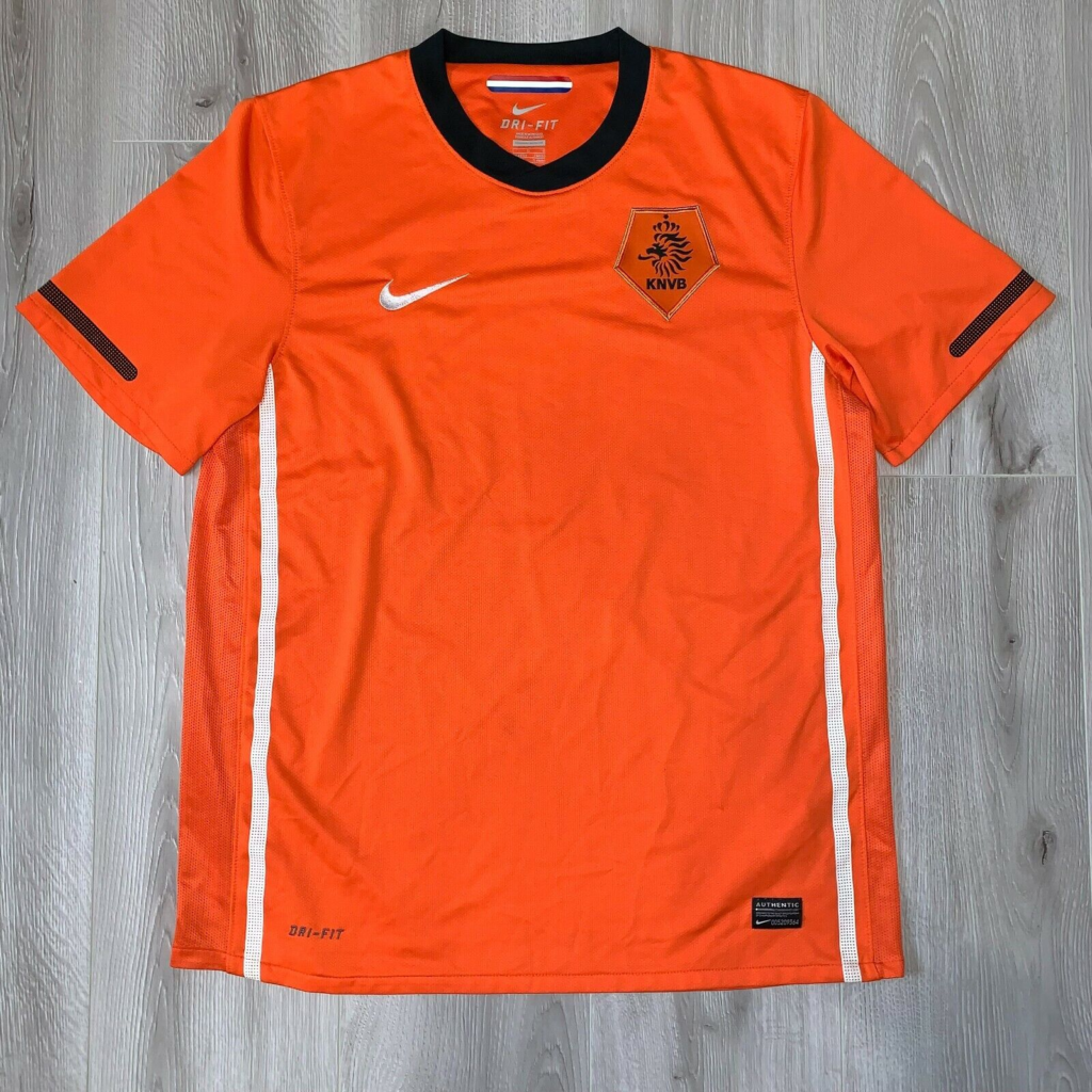 Esta camisa é conhecida como a “camisa do Robben”. Foi desenhada pela Nike e apresenta um design laranja com detalhes em preto e verde. A camisa foi usada pela seleção da Holanda na Copa do Mundo de 2010, onde a equipe chegou à final.