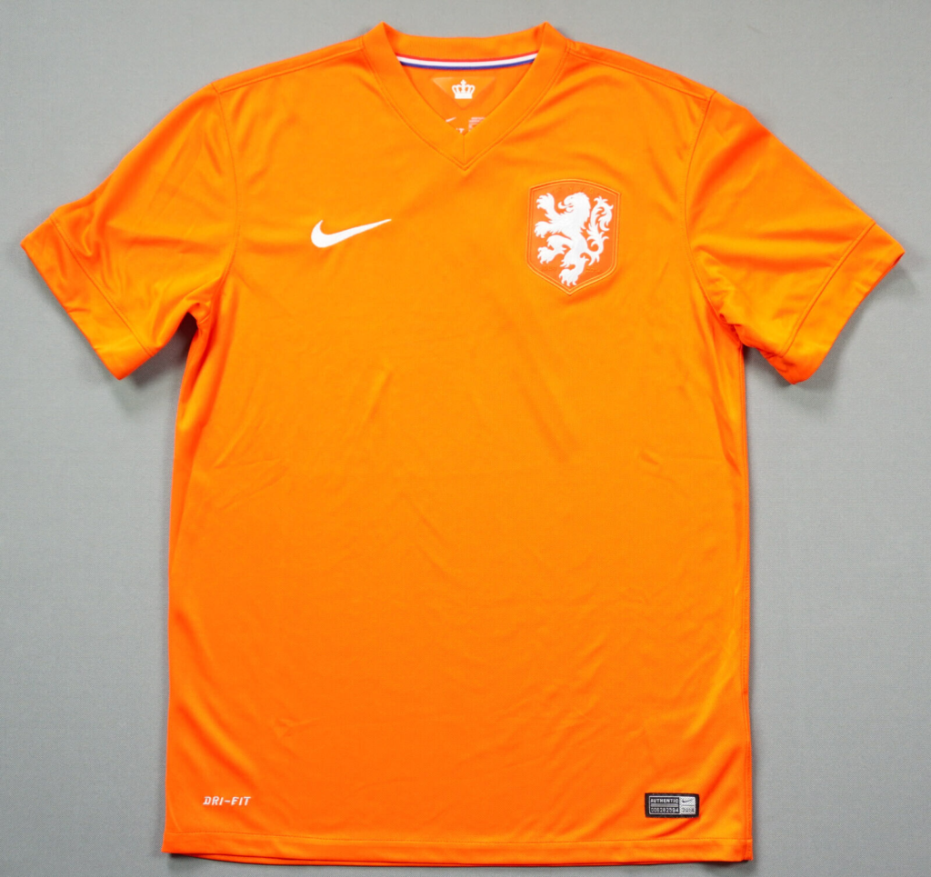 Esta camisa é conhecida como a “camisa do Sneijder”. Foi desenhada pela Nike e apresenta um design laranja com detalhes em branco. A camisa foi usada pela seleção da Holanda na Copa do Mundo de 2014, onde a equipe chegou à fase de grupos.