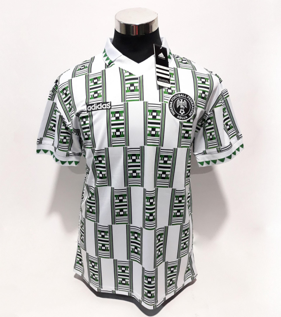 Esta camisa é considerada uma das camisas de futebol mais icônicas de todos os tempos. Foi desenhada pela Nike e apresenta um design verde e branco com detalhes em preto. A camisa foi usada pela seleção da Nigéria na Copa do Mundo de 1994, onde a equipe chegou às oitavas de final.